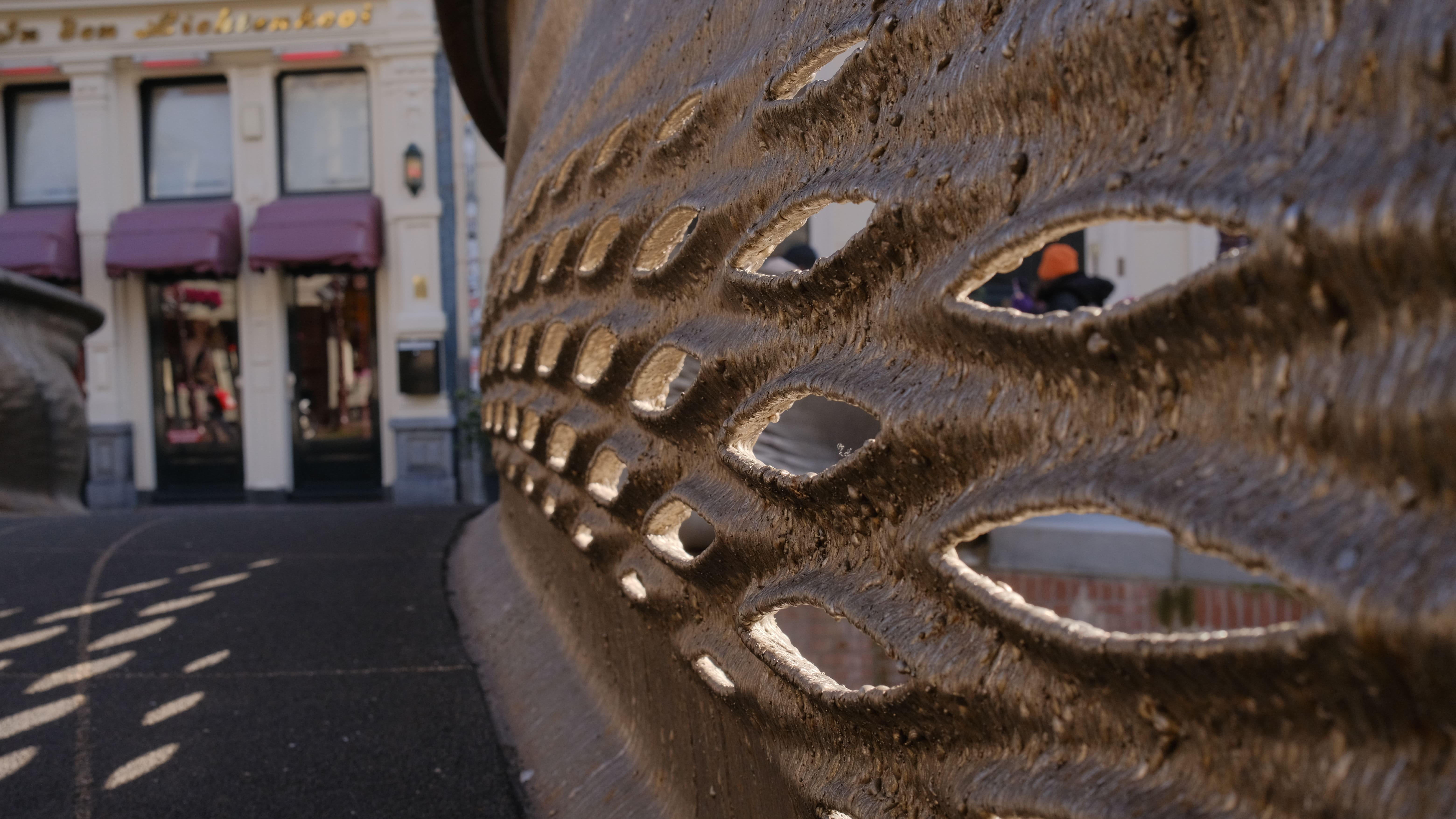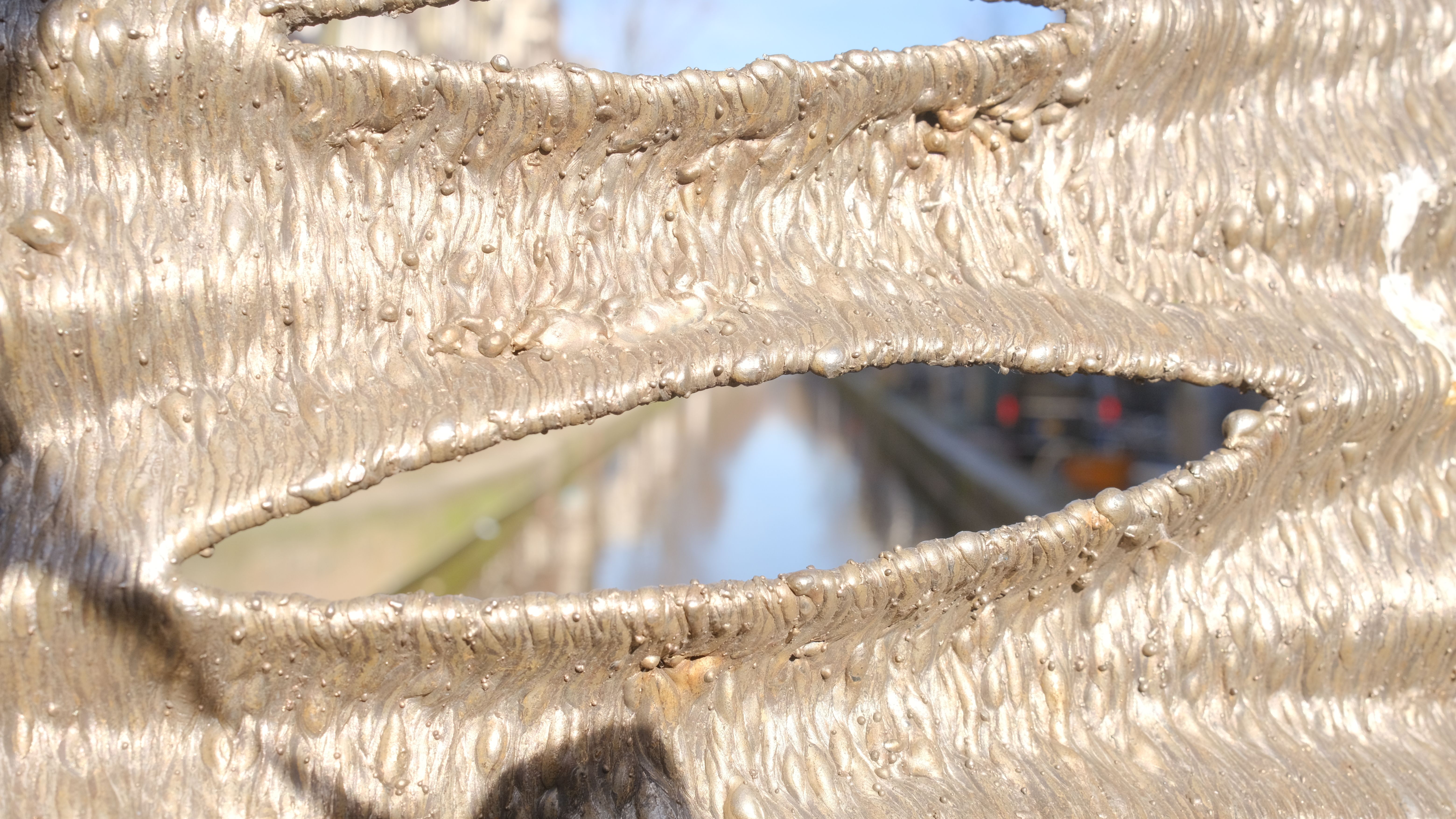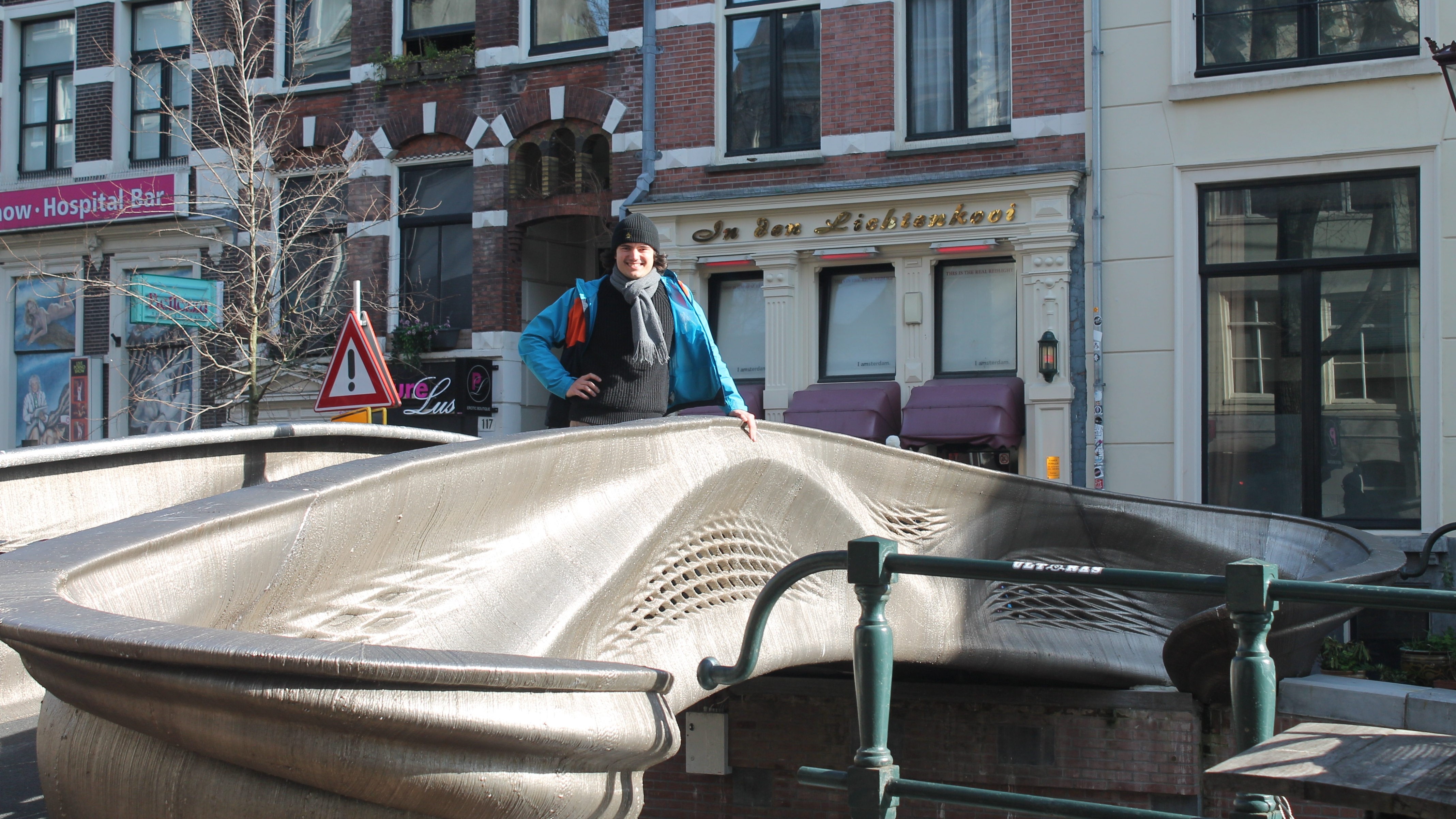 The in-service MX3D Bridge subject to partial sun exposure in February 2022. Photograph by Anton Stolper.