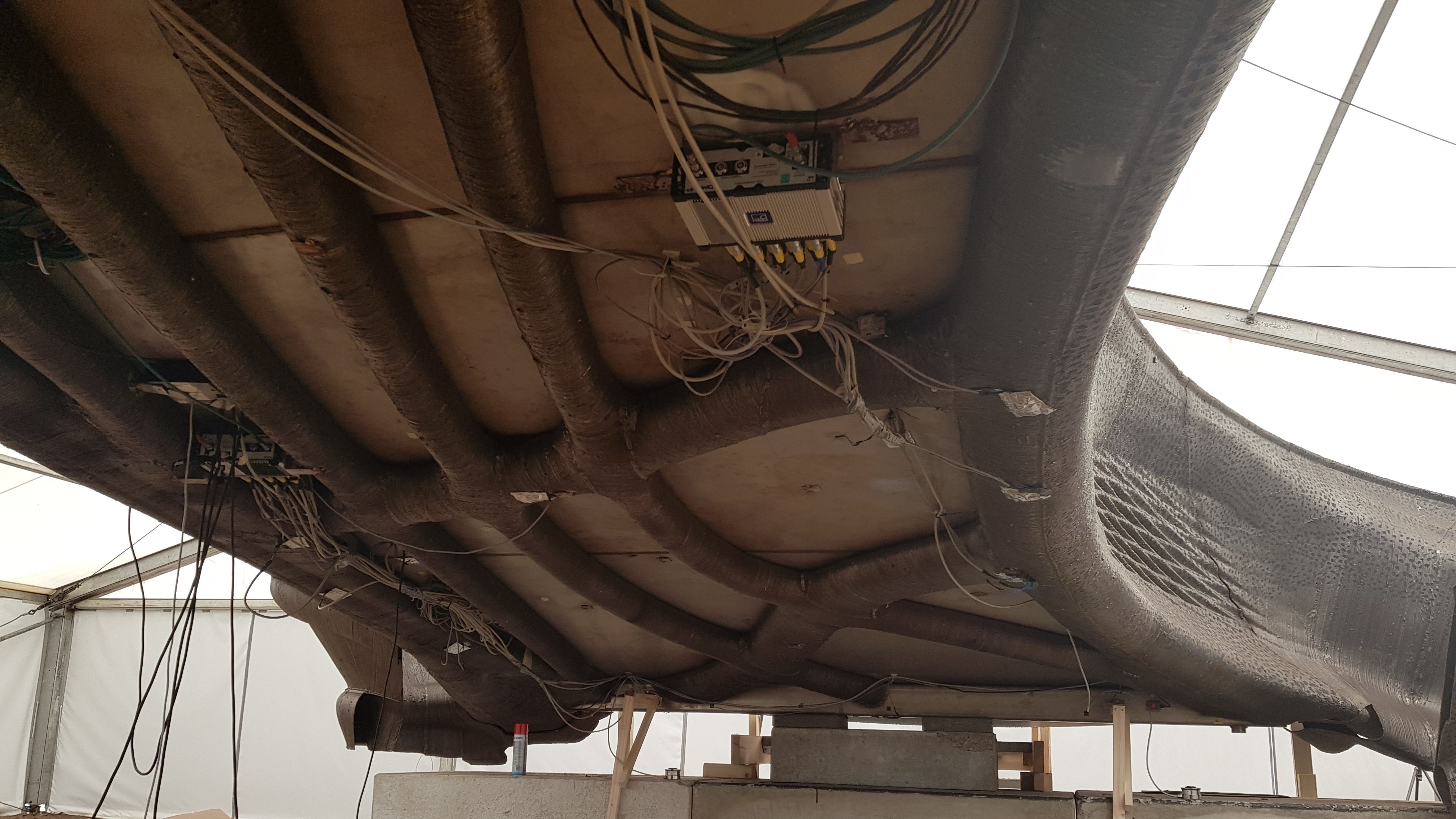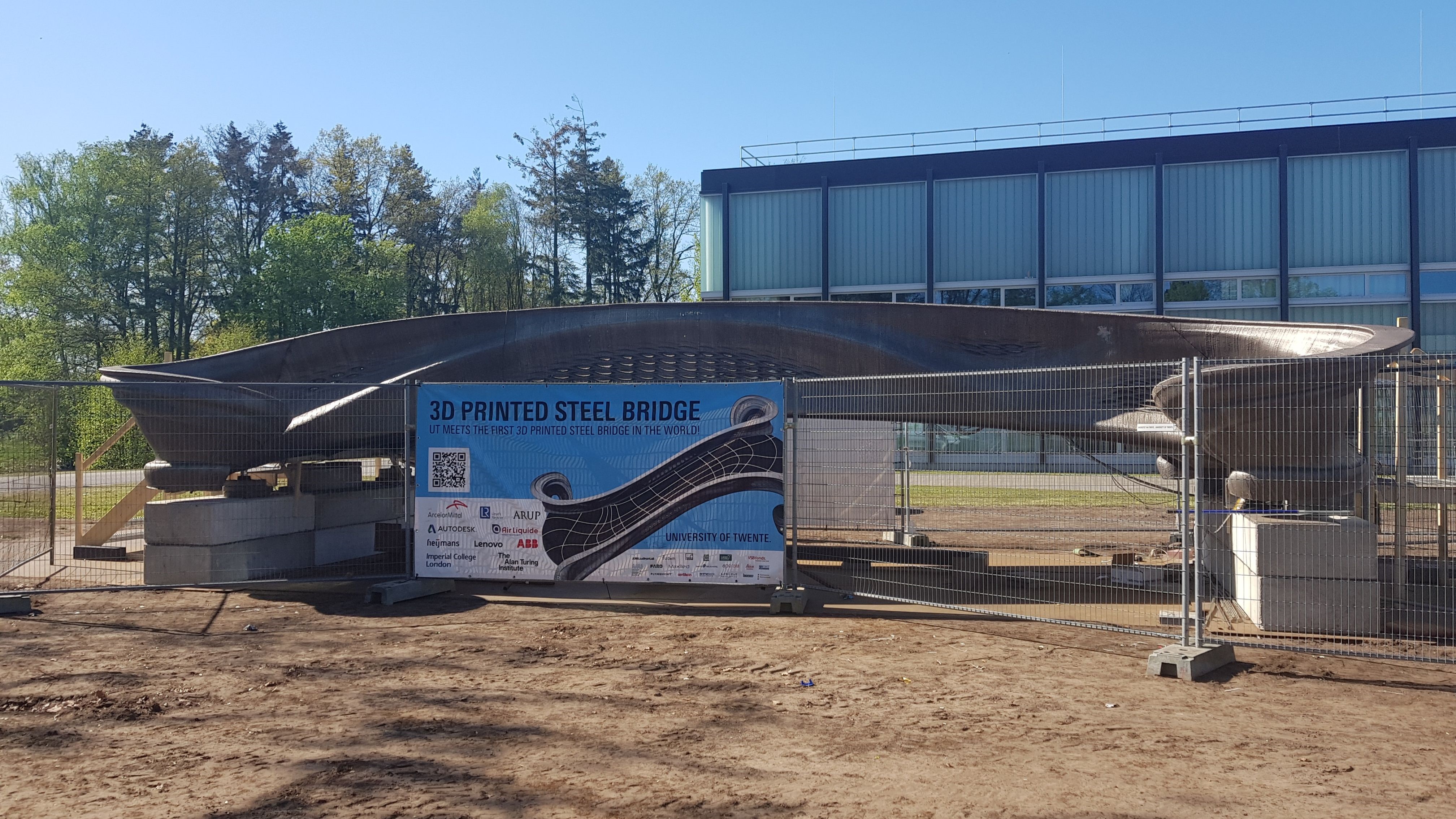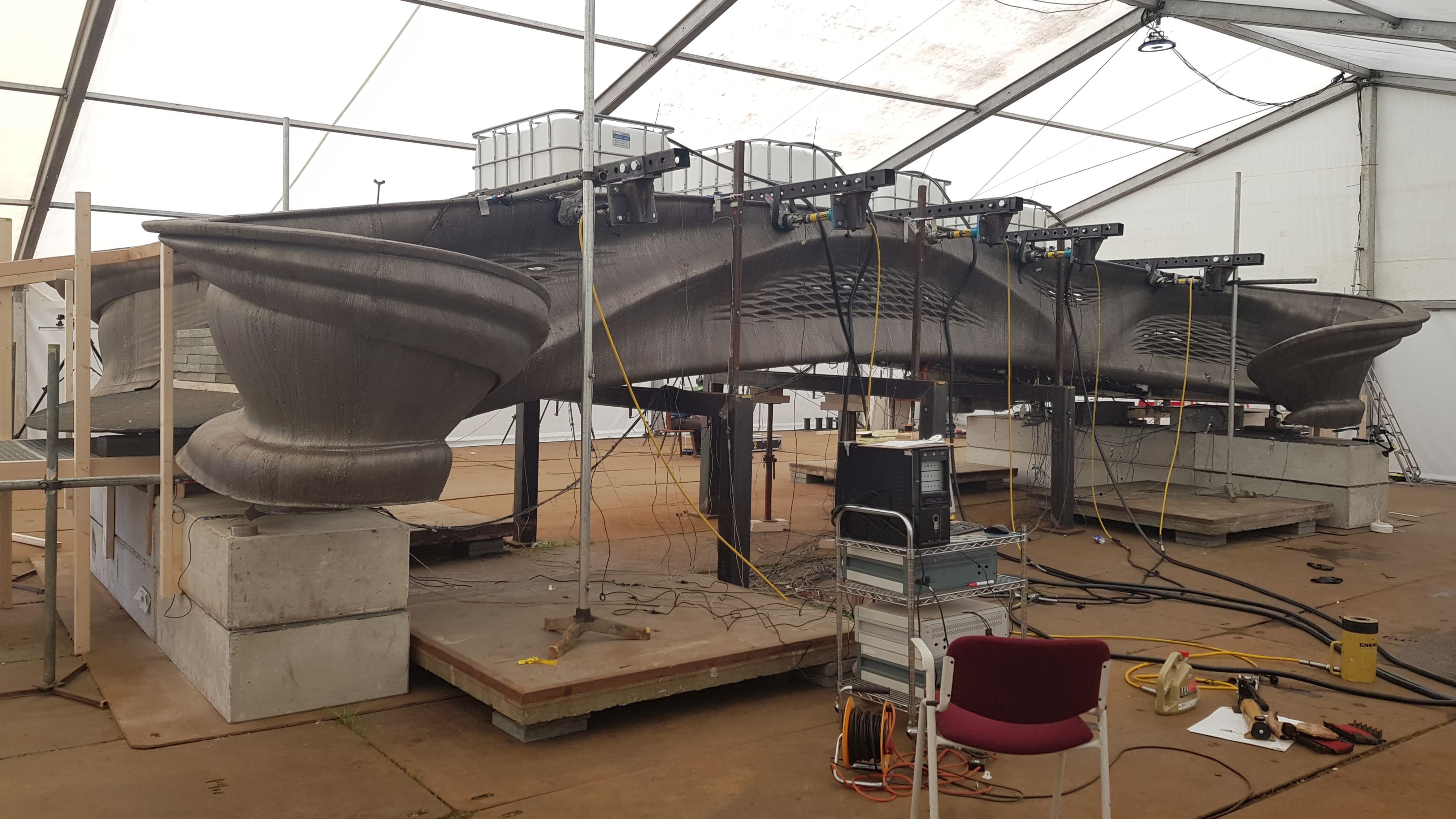 The MX3D Bridge was placed in a tent at the University of Twente for load testing.